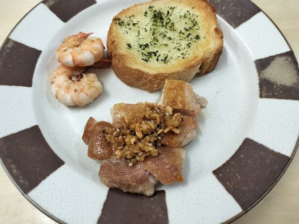 ガーリックシュリンプ、鶏むね肉のガーリック炒め、ガーリックトーストです。