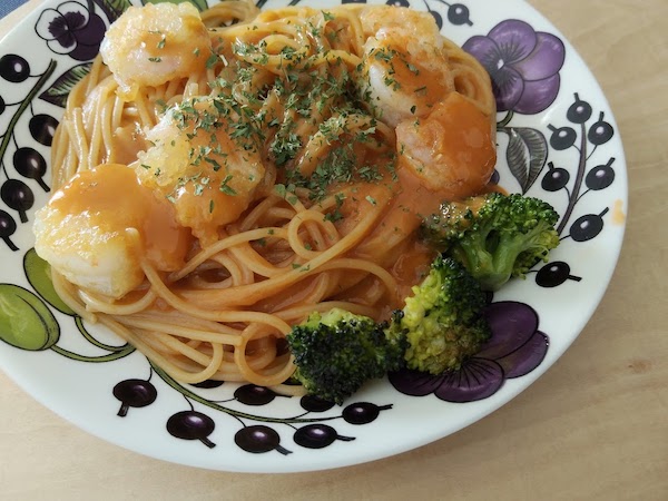 お昼にエビクリームパスタを食べて。