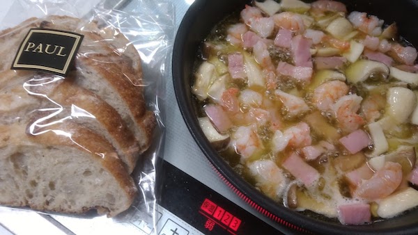 日曜日にサツエキ東口近くのステラプレイスにあるPAULで美味しいパンを買ってきたので、夕食はテキトーアヒージョです。今日はアルコール解禁(いや、いつも解禁なんですが)で昨日の分を取り返しちゃいました笑