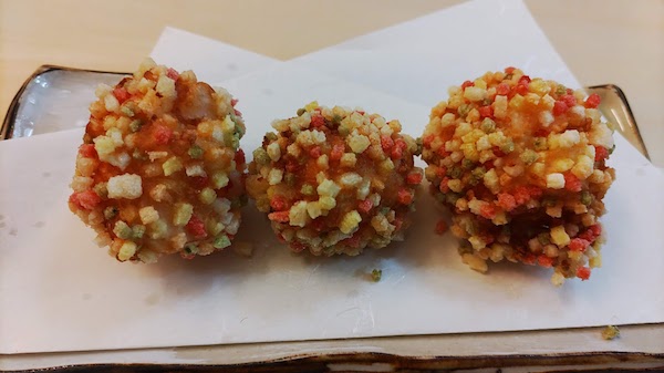 「餡掛け炒飯」は嫌い。「中華丼」は大嫌い。「天津飯」は食べたことなし。「餡掛け茶碗蒸し」は餡を捨てて食べます。同じように「海老しんじょう」も餡が嫌いなんです。ですが、ふと「味を濃く作って5色あられをまぶして揚げる」と美味しそうなことに気がついたのです。