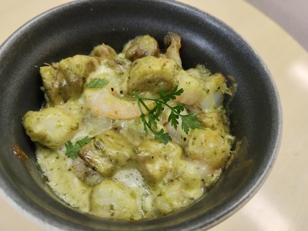 むきえびの余りは、、、アボカドと混ぜて、、、水分取ったヨーグルト+マヨ+ジェノベーゼソースで和えてから焼きました。