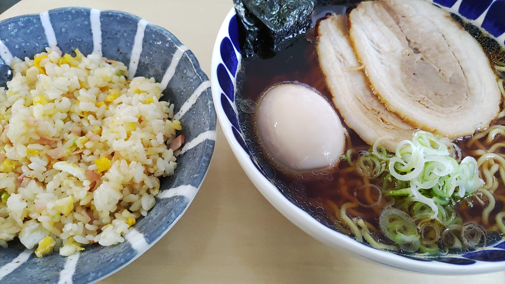 朝食を食べ損ね、お昼ご飯も遅かったので醤油ラーメンセット(半チャーハン)を食べました。自宅でですけどね。