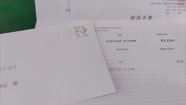 札幌出張はお休みさせていただきました。本日宿泊予定だったホテルの予約詳細を見ますと「前日連絡で20パーセント」となっていたので、昨日のうちに慌ててキャンセルの連絡をしました。今日になって早速請求書が届きまして、その素早さに感服しました。