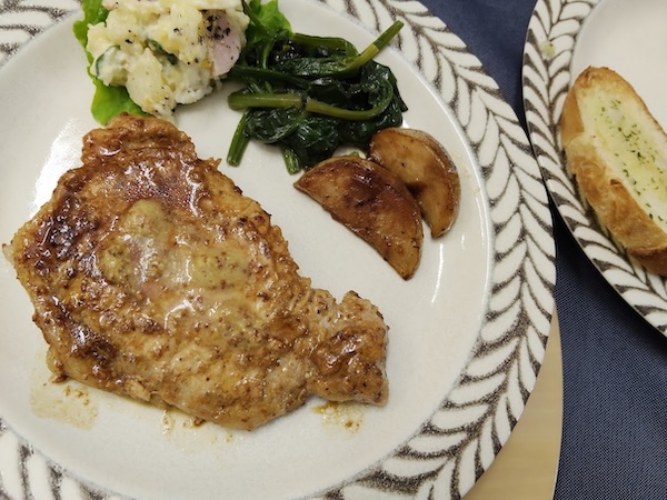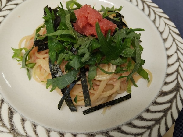 昼食はタラコパスタ、夕食は昨日と同じお肉をハニーマスタードで食べました。